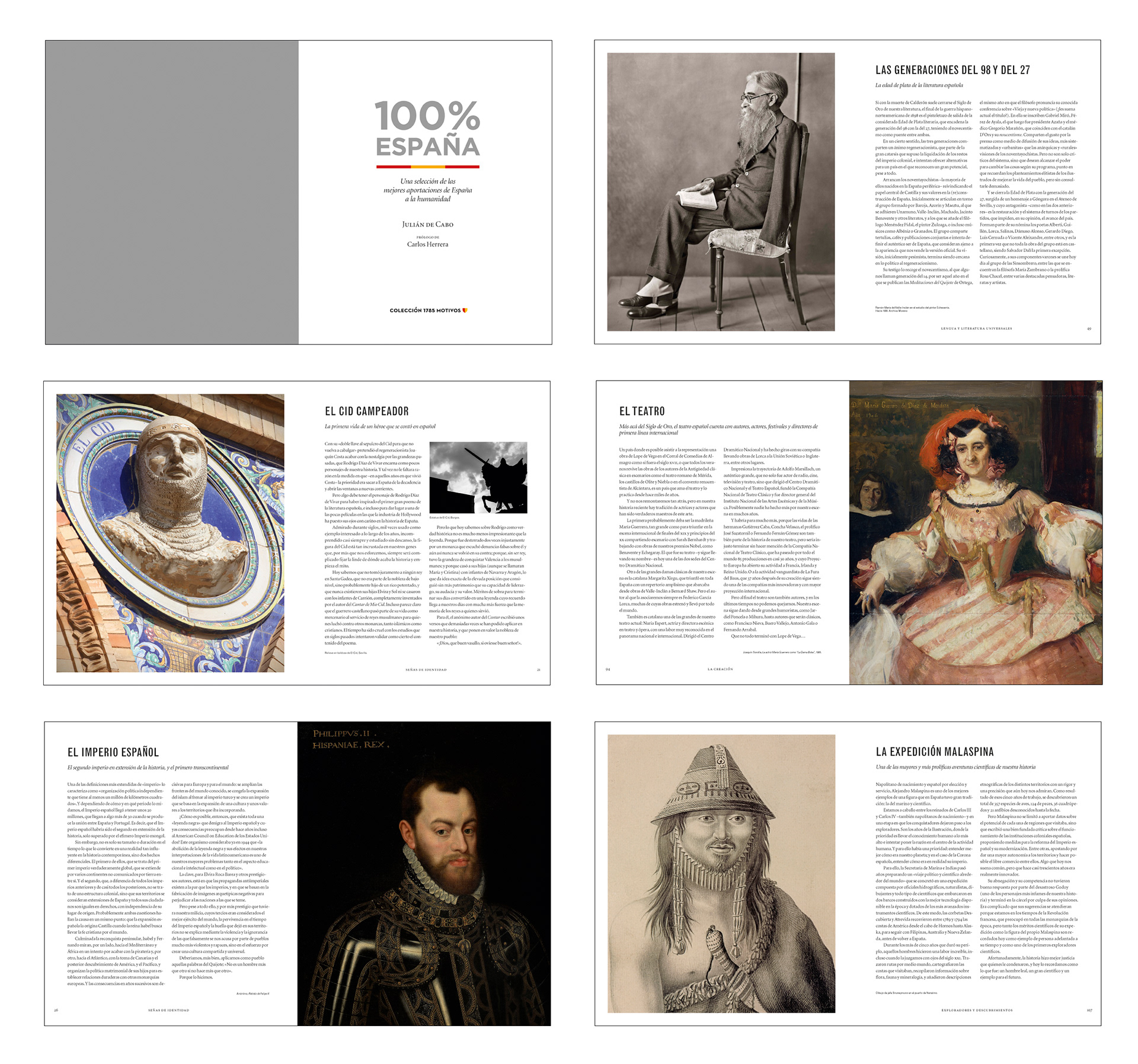 Diseño gráfico y maquetación del libro «100% España. Una selección de las mejores aportaciones de España a la humanidad». Cliente: 1785